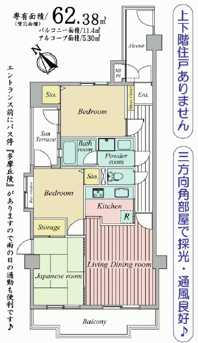 交通:京王線/北野駅 徒歩8分 屋齡:31年 面積:壁芯 62.38m2